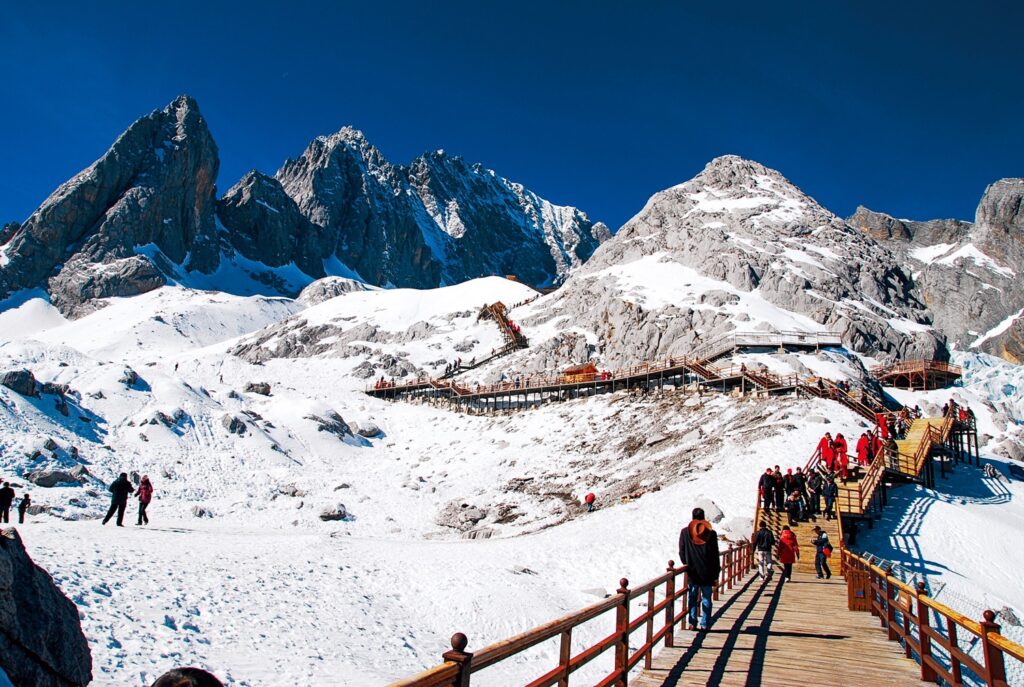 - Khu Núi tuyết Ngọc Long: Quý khách đi cáp treo nhỏ lên thăm Vân Tam Bình – độ cao 3200 m ngắm cảnh đẹp Núi tuyết Ngọc Long - ngọn núi cao 5596 m tuyết phủ quanh năm. Phần băng vĩnh cửu ánh lên một màu xanh như ngọc. Lại gọi đây là núi trinh nữ vì cho đến nay con người chưa một lần chinh phục được nó. (Bao gồm cáp treo lên đỉnh Vân Sơn Bình)